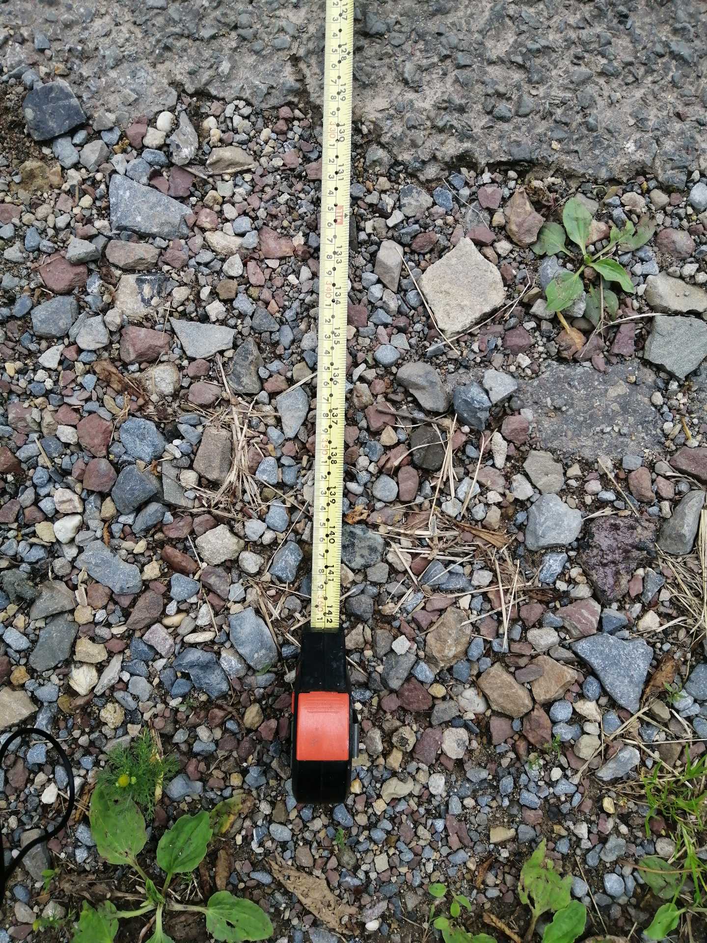 A tape measure that shows 361cm (142in) on the ground next to a road