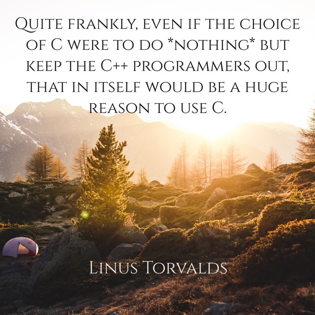 A 'facebook inspirational quote' style of content with a picture of a forest and mountains with a quote from Linus Torvalds that says 'Quite frankly, even if the choice of C were to do *nothing* but keep the C++ programmers out, that in itself would be a huge reason to use C.'
